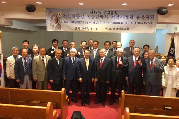 대한민국건국대통령 이승만 박사 기념사업회 뉴욕지회(회장 안창의 목사)에서는 지난 5월 18일 뉴욕프라미스교회 겟세마네 성전에서 제13차 연차 총회를 열었다. 총회에 앞서 시작된 예배는 현영갑 목사(교육부장)의 인도로 시작, 테너 김영환 집사가 애국가 및 미국가를 제창으로 이어진 국민의례에 이어 김영호 장로의 대표기도 및 회장 안창의 목사의 개회사가 이어졌다. 안창의 목사는 “건국69주년을 보내며, 본회의 2017년 연차총회를 열게 됨에 감사를 드린다. 지금까지 어려운 여건 속에도 물심양면으로 도와주신 자문위원, 이사회, 여러 임원 및 회원들에게 감사를 드린다”고 전하며 “2016년부터 탄핵 정국을 보내면서 우리는 왜 이승만 건국 정신을 계승 발전 시켜야 하는지에 대한 확실한 해답을 얻게 되었다. 그러나 이승만 건국 대통령이 그렇게 목숨을 걸고 지키려 했던 자유 민주주의의 뿌리가 어느 정도 내렸다고 방심하고 있던 차에 자유 민주주의는 민중이 이끄는 사회 문주주의의 체제로 변질되어 버리고 말았다. 이것이 진정한 민주주의처럼 보이지만 역사상 사회민주주의의 성공은 그 어느 시대에도 업었고 잠시 성공한 것 같았던 서구 북 유럽 나라들조차 이제는 폐기처분하고 만 것이 사회 민주주의이다. 저들은 이승만을 인정하지 않으려 할 것이다. 그러나 우리의 사명은 자명하다. 저들이 무너뜨리려 하면 우리는 세우고 저들이 자빠뜨리면 우리는 다시 세우는 것이다. 우리의 소망이 우리의 후손들에게도 꿈과 소망이 되도록 본회는 이승만 학당을 개설하여 젊은 시대에 이승만 건국 정신을 가르치려 한다. 장확회를 만들고 꿈 많은 젊은이를 발굴하여 대한민국이 존재하는 한 이승만이 국부로 존경을 받도록 기초를 세우려 한다. 동참해 주시길 바란다”며 개회사를 통해 대한민국의 현실과 문제, 그리고 향후 나아갈 방향을 제시하기도 했다.