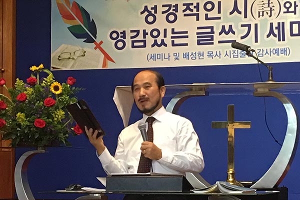 대뉴욕지구한인목사회(회장 김상태 목사)의 주최로 지난 6월 6일 “성경적으로 시와 영감있는 글을 쓰는 세미나”를 뉴욕선한목자교회(박준열 목사)에서 개최했다. 세미나에 앞서 회장 김상태 목사의 인도로 오전 10시 30분부터 진행된 출판감사예배는 한재홍 목사(뉴욕신광교회 원로)의 기도, 시23:1~6을 본문으로 송병기 목사(뉴욕목양장로교회, 전뉴욕교협회장)의 “내 잔이 넘치나이다”의 제목으로 설교말씀을 전했으며, 현뉴욕교협회장 김홍석 목사가 축하의 메시지를 전했다.