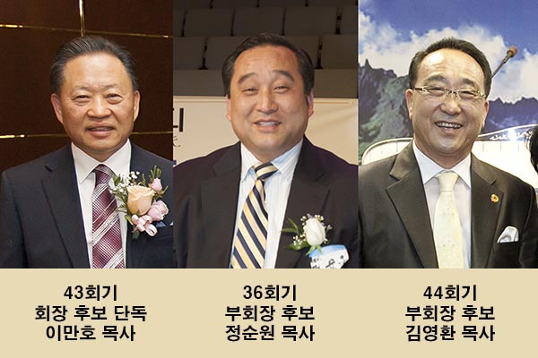 이번 후보자들의 특징은 후보자 전원이 목사회 회장을 역임했다는 부분이 특징이다. 회장 후보 이만호 목사는 목사회 43회기, 정순원 목사는 36회기, 그리고 김영환 목사는 44회기에 각각 회장을 역임했다.