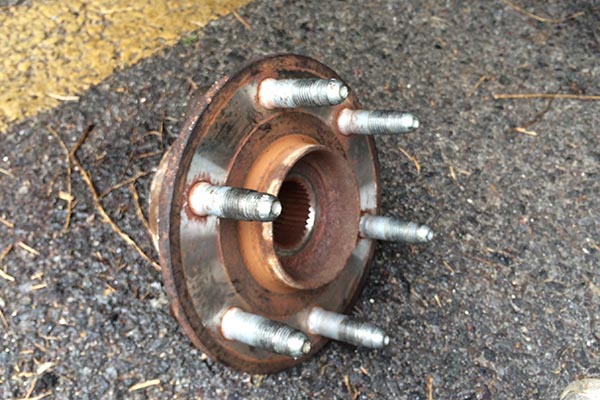 휠 베어링이 빠진 모습, 가운데 액슬이 그대로 나와 있다. 이것은 사실 CV 조인트 바깥 부분이 되기도 한다.
