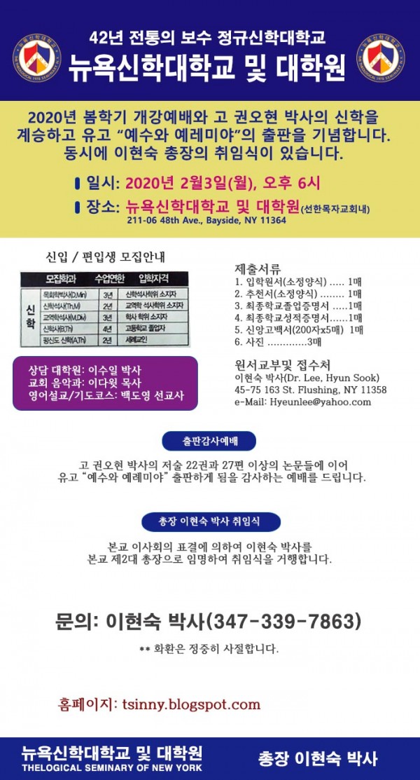 본 뉴욕신학대학교 및 대학원(총장 이현숙 박사)에서는 오는 2월 3일에 2020년도 봄학기 개강 및 고권오현 박사의 유고인 "예수와 예레미야"의 출판을 기념하며 감사예배를 드립니다 아울러 고권오현 박사를 이어 이현숙 박사의 제2대 총장 취임식을 갖습니다.