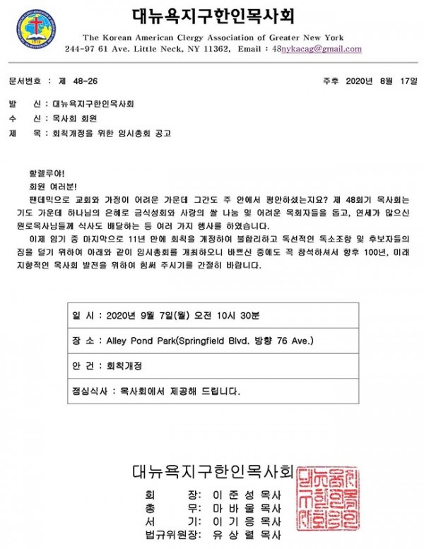 • 대뉴욕지구한인목사회(회장 이준성 목사)에서는 오는 9월 7일 "회칙 개정을 위한 임시총회"를 다음과 같이 개최합니다.  코로나19로 인하여 장소는 야외에서 하기로 하였으며, 알리폰트 파크(Alle…
