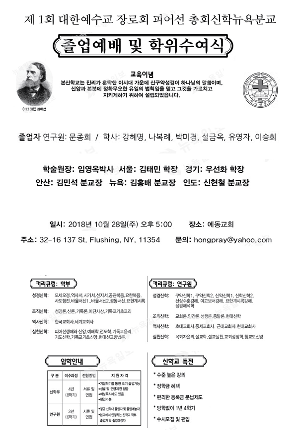 행사안내 | 제1회 피어선총회신학뉴욕분교 졸업에배 페이지 정보 편집인 작성일18-10-24 12:31 목록 본문 . Copyrightⓒ 미주크리스찬타임즈 & KACTIMES.com 댓글목록 등록된 댓글이 없습니다. 목록