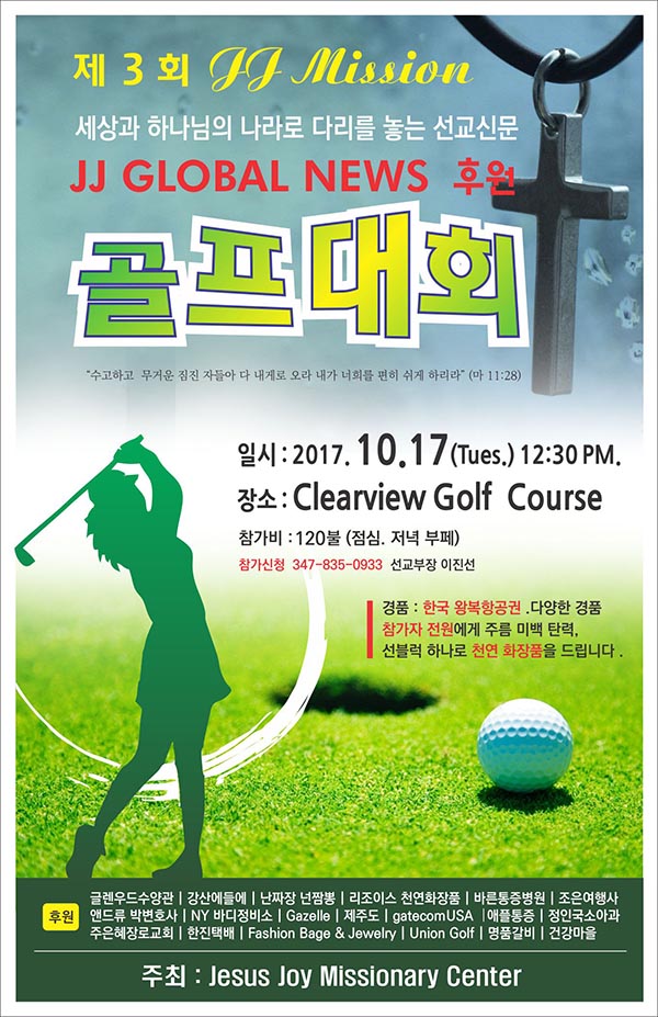- JJ 미션센터에서는 글로벌 뉴스 창간 후원을 위한 골프대회를 개최합니다. 오는 10월 17일 클리어뷰 골프장에서 개최되는 이날 행사에 많은 사회인사, 교계인사들이 초청되었습니다. 많은 분들의 참여…