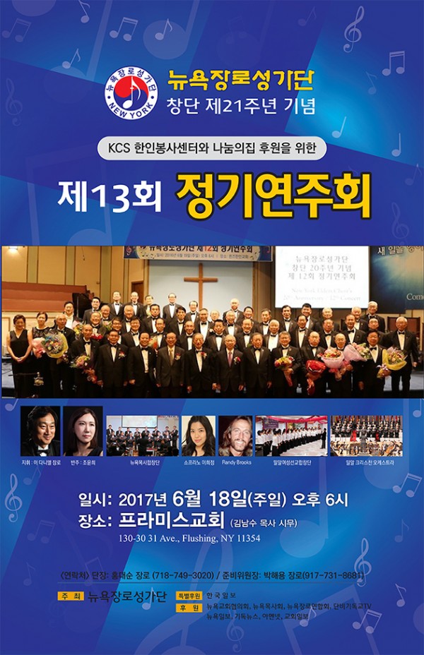 • 뉴욕장로성가단 창단 제21주년 기념 KCS 한인봉사센터와 나눔의 집 후원을 위한 제 13회 정기연주회   일시 : 2017년 6월 18일(주일) 오후 6시 장소 : 프라미스교회(김남수 목사…