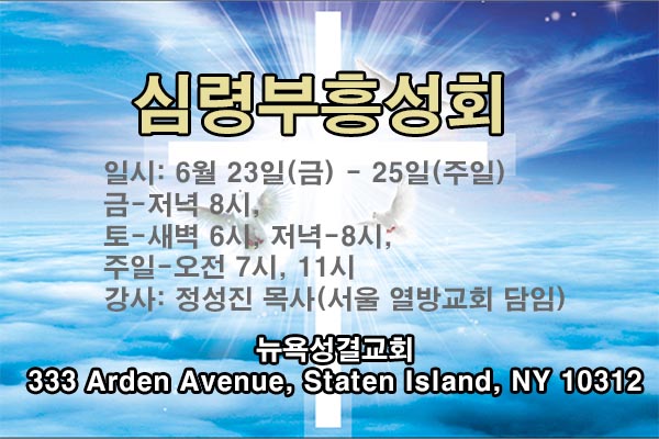 • 심령부흥성회 뉴욕성결교회에서는 오는 6월 23일(금) 부터 25일(주)까지 심령부흥성회를 개최합니다.  강사는 서울열방교회를 섬기시는 정성진 목사님이십니다. 스테이튼 아일랜드, 브르클린의 인근 분…